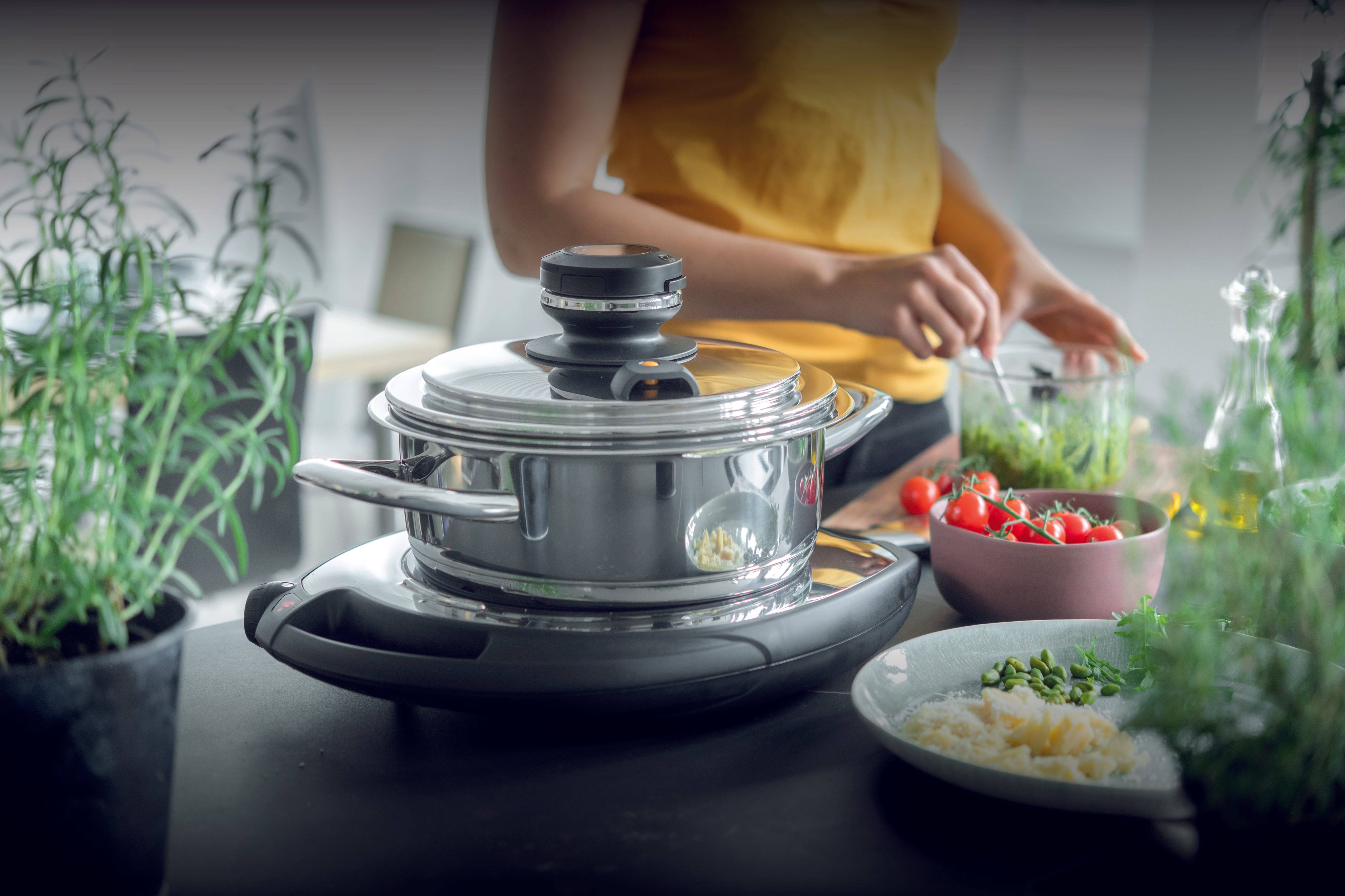 Damit wird das Garen ohne Zusatz von Wasser möglich gemacht: Der Boden nimmt die Wärme schnell auf, speichert sie effizient und gibt sie gleichmäßig an das Gargut weiter. Beim Garen entsteht ein geschlossener Kreislauf zwischen Topfboden, Kühlwandzone und Deckel, der das Austreten von Dampf verhindert und dafür sorgt, dass die Lebensmittel in ihrem eigenen Saft garen. Dies schont die Nährstoffe und den Geschmack der Speisen.